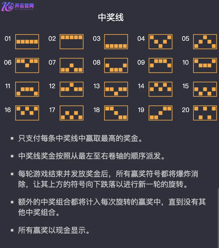 所有中奖线仅支付最高奖金,中奖顺序自左至右计算,不同中奖线的奖金可叠加。