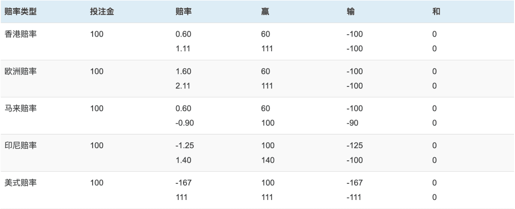 • 当赔率为正数时,计算方式与香港赔率相同;